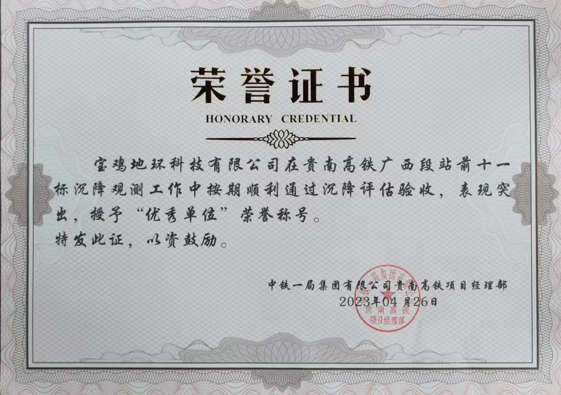 寶雞地環(huán)測繪人努力拼搏的精神,受到了中鐵一局集團(tuán)有限公司貴南高鐵項(xiàng)目經(jīng)理部領(lǐng)導(dǎo)的高度贊揚(yáng)和肯定。