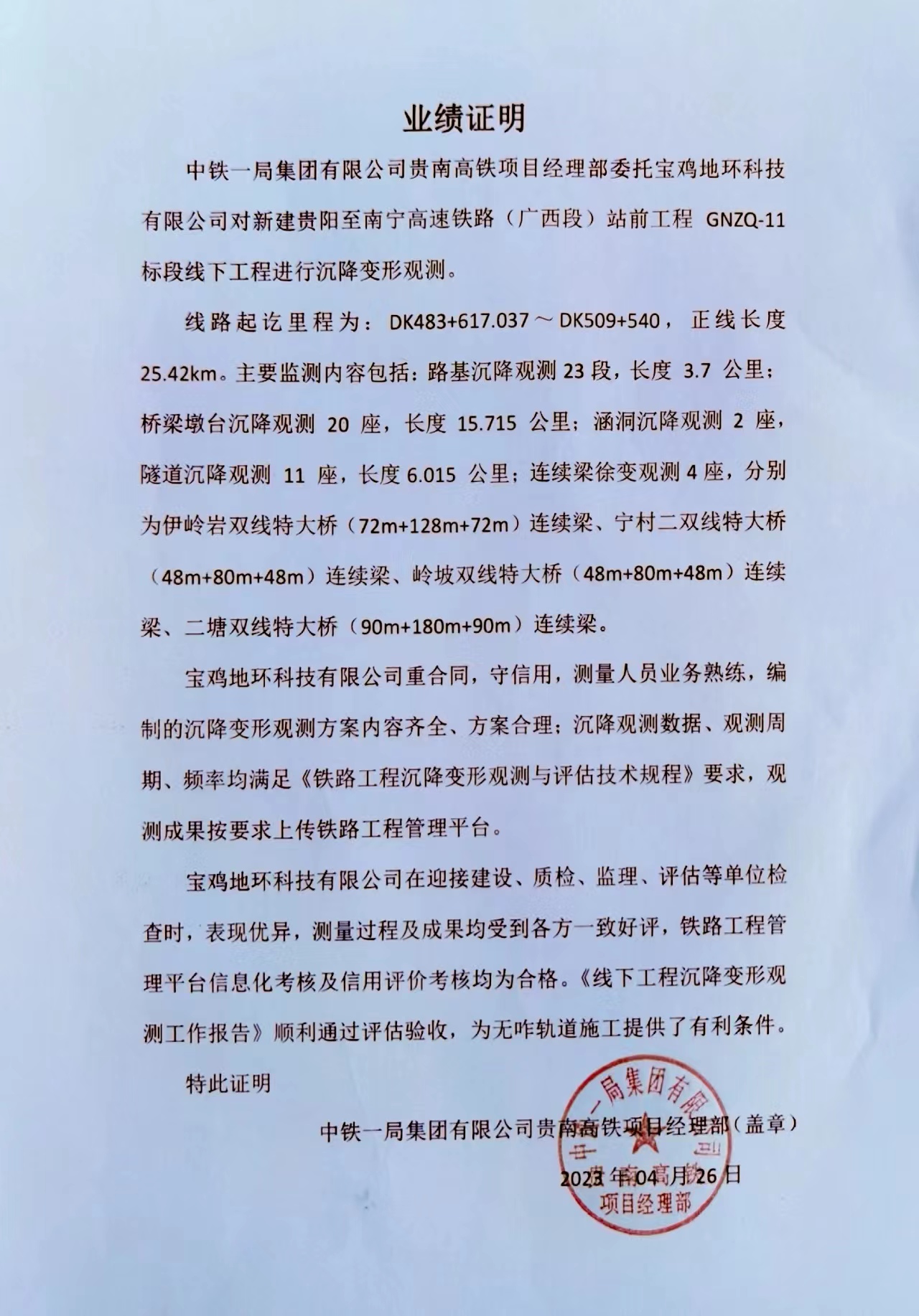 中鐵一局集團(tuán)有限公司貴南高鐵項(xiàng)目經(jīng)理部委托寶雞地環(huán)科技有限公司對新建貴陽至南寧高速鐵路 (廣西段)站前工程 GNZQ-11標(biāo)段線下工程進(jìn)行沉降變形觀測。